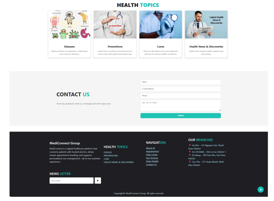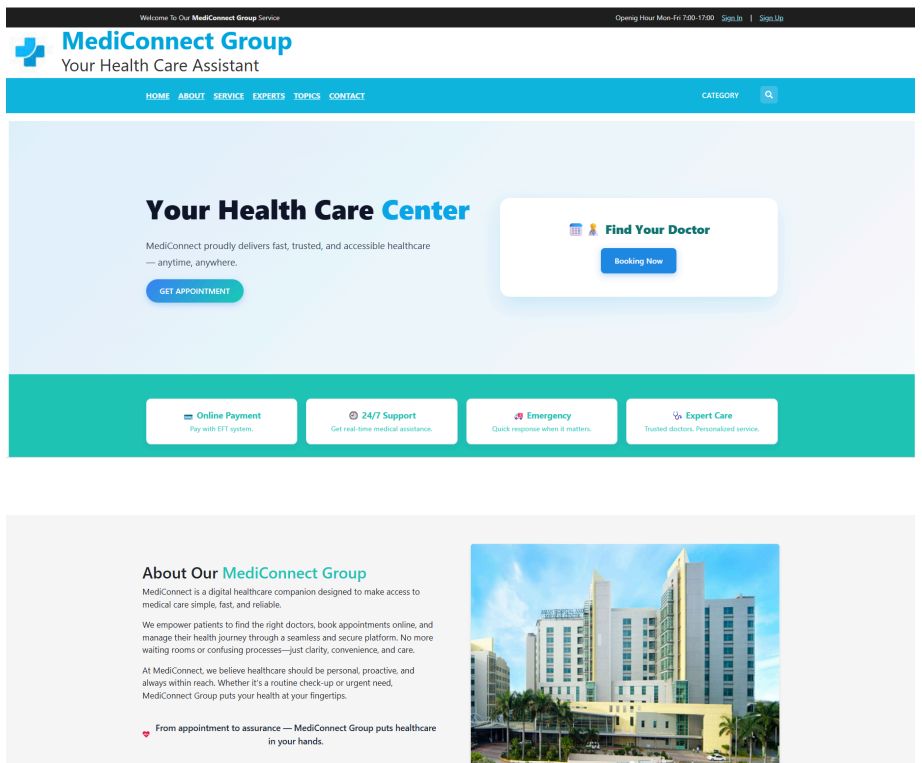 Dự án được phát triển bởi nhóm 4 gồm các thành viên: Mai Trần Thụy Đan (trưởng nhóm), Lê Thị Kiều Duyên, Trần Quốc Toàn và Lưu Anh Thuận. MediConnect hướng đến việc hiện đại hóa quy trình khám chữa bệnh, giúp người dùng dễ dàng tìm kiếm bác sĩ, đặt lịch hẹn trực tuyến và theo dõi thông tin y tế mọi lúc, mọi nơi.