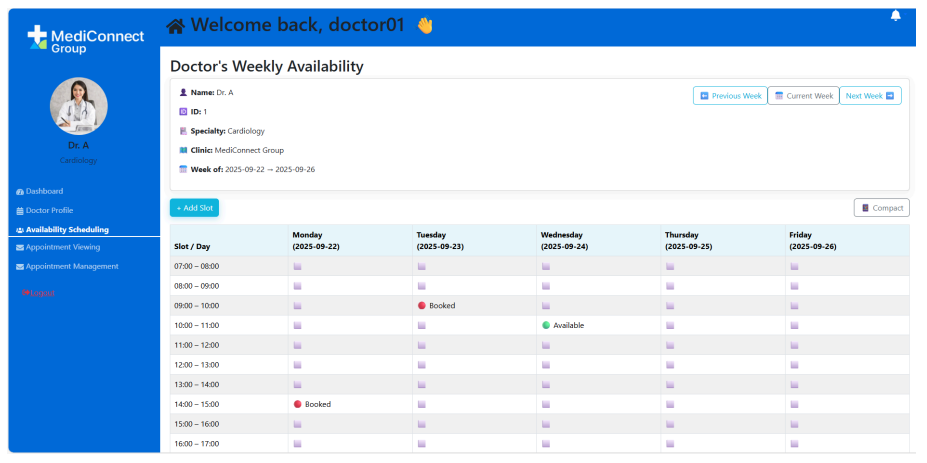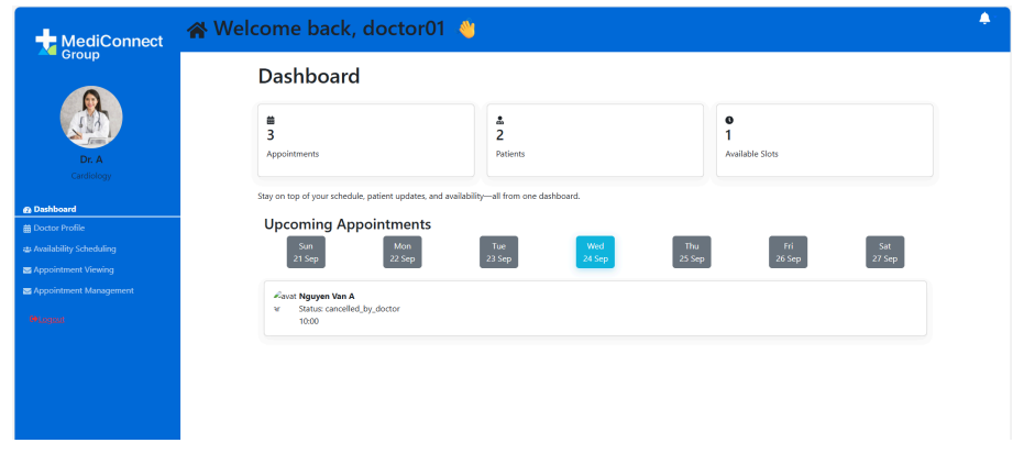 Đối với bác sĩ, MediConnect cung cấp các tính năng quản lý hồ sơ cá nhân, cài đặt lịch làm việc và theo dõi lịch hẹn với bệnh nhân. Hệ thống cũng tự động gửi thông báo khi có thay đổi trong lịch khám, đảm bảo quy trình vận hành thông suốt.