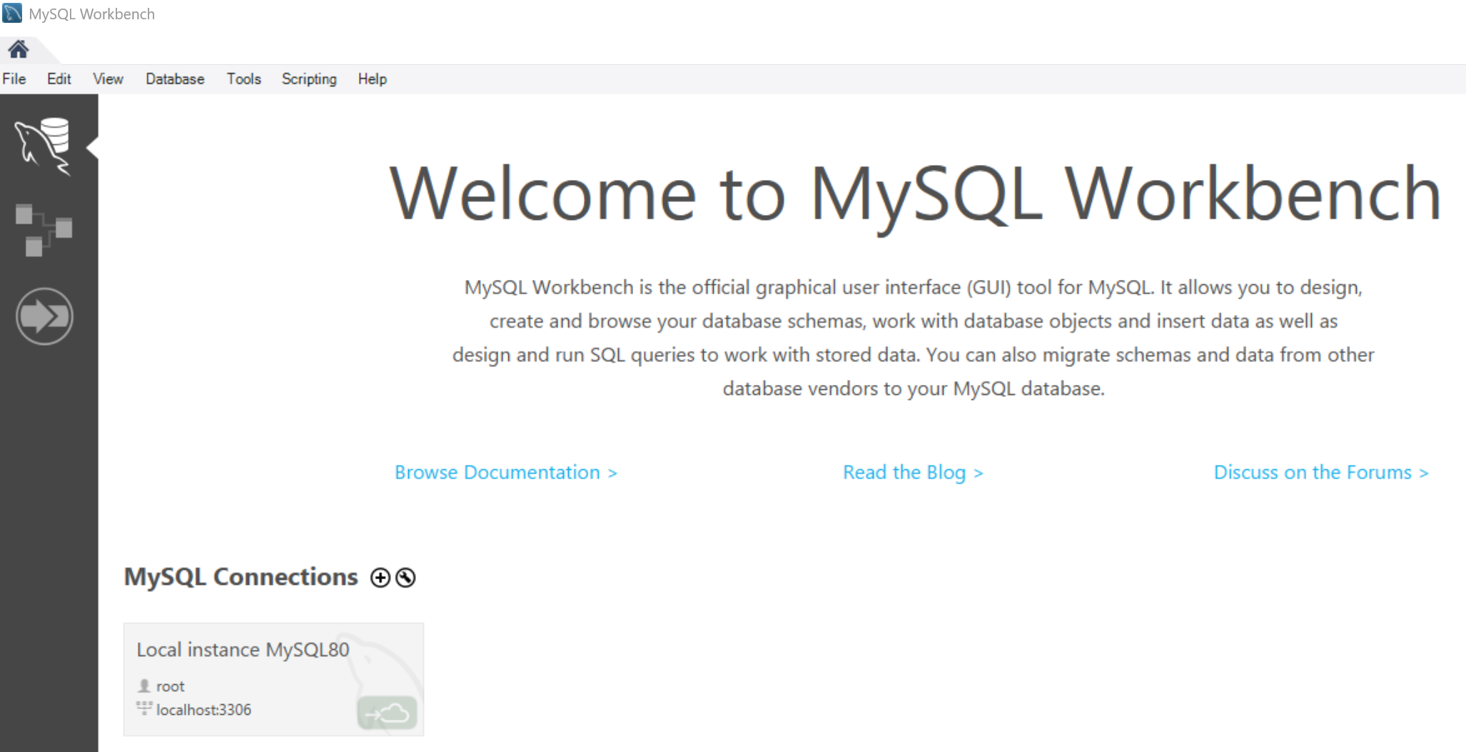 Khi cửa sổ MySQL Workbench mở ra là quá trình cài đặt đã thành công và có thể bắt đầu sử dụng.