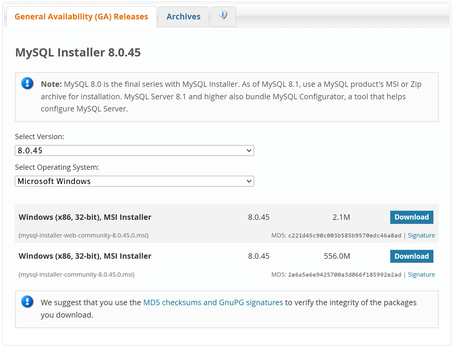 - Trong tab “General Availability (GA) Releases”, trang “MySQL Installer x.x.xx”, :