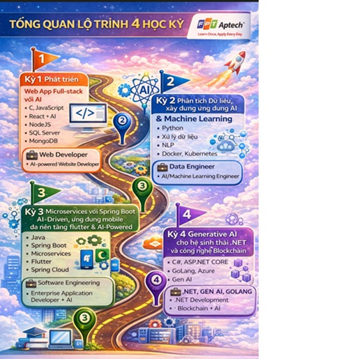 Việc lựa chọn một lộ trình học tập đúng hướng ngay từ đầu sẽ giúp sinh viên không chỉ bắt kịp xu hướng mà còn sẵn sàng bứt phá trong thị trường công nghệ toàn cầu. Đây cũng chính là định hướng đào tạo mà FPT Aptech đang theo đuổi, nhằm giúp sinh viên trở thành những lập trình viên thế hệ mới trong kỷ nguyên AI.