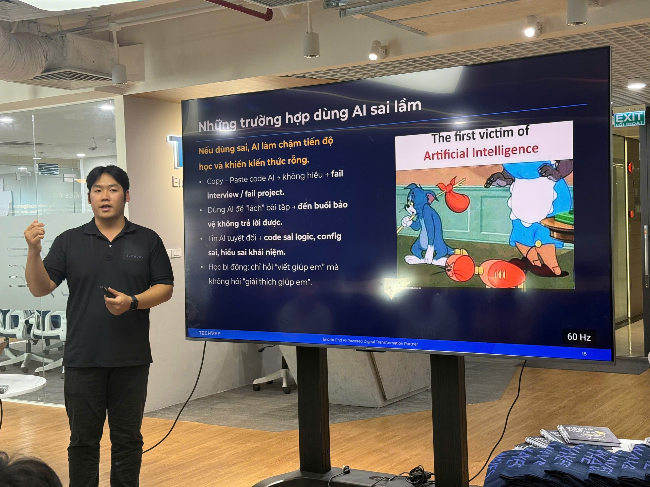 Song song với đó, TECHVIFY dành thời gian trao đổi về chủ đề được nhiều sinh viên quan tâm: ứng dụng AI trong công việc. Đại diện công ty nhấn mạnh rằng: “AI là một công cụ mạnh mẽ, giúp tăng tốc độ làm việc, tối ưu workflow và hỗ trợ lập trình lẫn tuyển dụng. Tuy nhiên, AI chỉ thật sự hiệu quả khi người dùng có kiến thức nền tảng vững vàng và biết cách chọn lọc thông tin. Việc phụ thuộc hoàn toàn vào AI dễ dẫn đến sai lệch, tạo ra kết quả thiếu chính xác”.