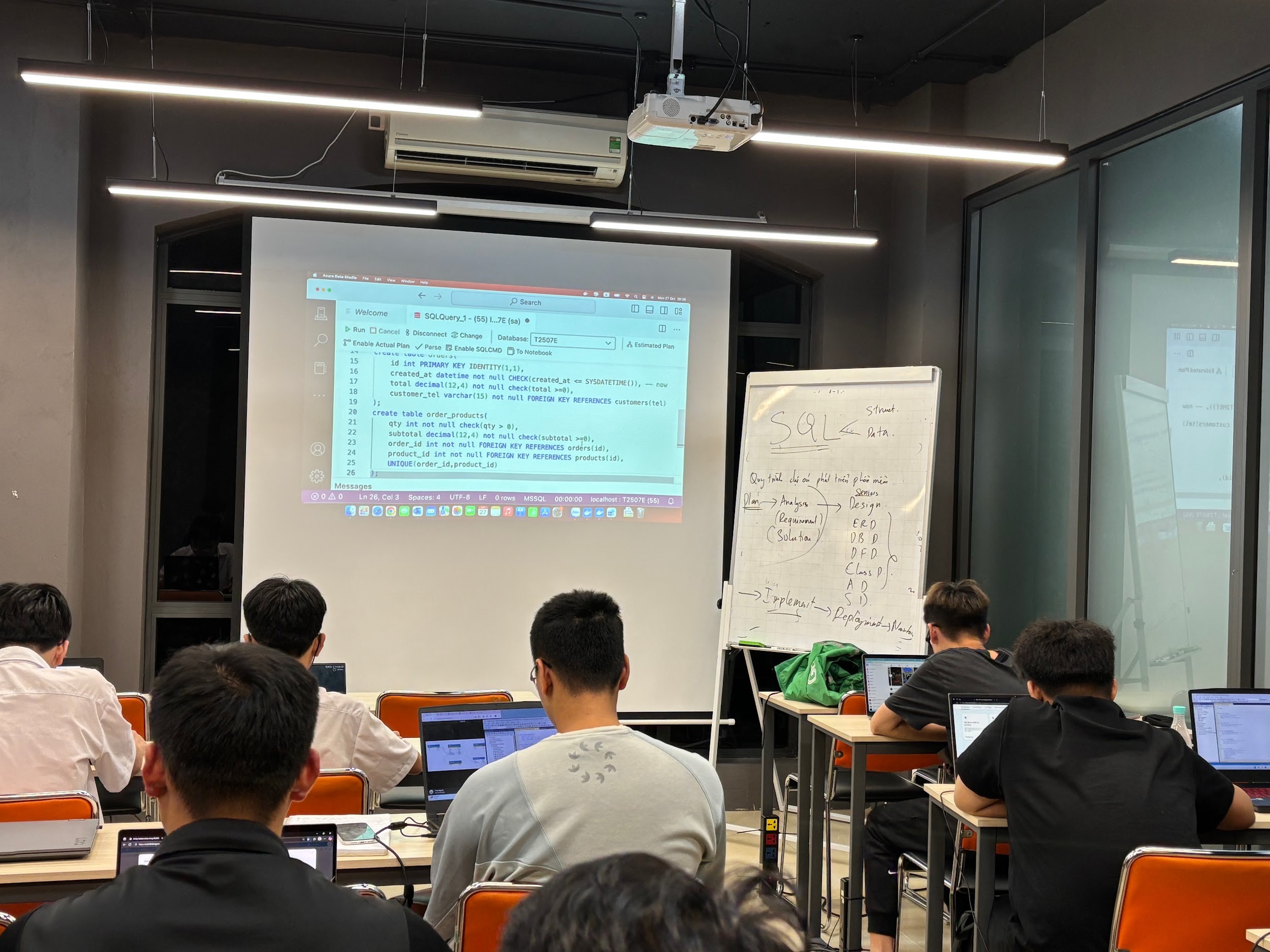 Không khí học tập sôi nổi đang lan tỏa trong buổi học môn Cơ sở dữ liệu của lớp T2507E, FPT Aptech. Sau gần bốn tháng học tập, các sinh viên đã đi qua nhiều chặng đường đáng nhớ – từ những ngày đầu còn bỡ ngỡ với những khái niệm lập trình cơ bản, đến hiện tại khi đã tự tin xử lý các bài thực hành phức tạp và làm việc nhóm hiệu quả.