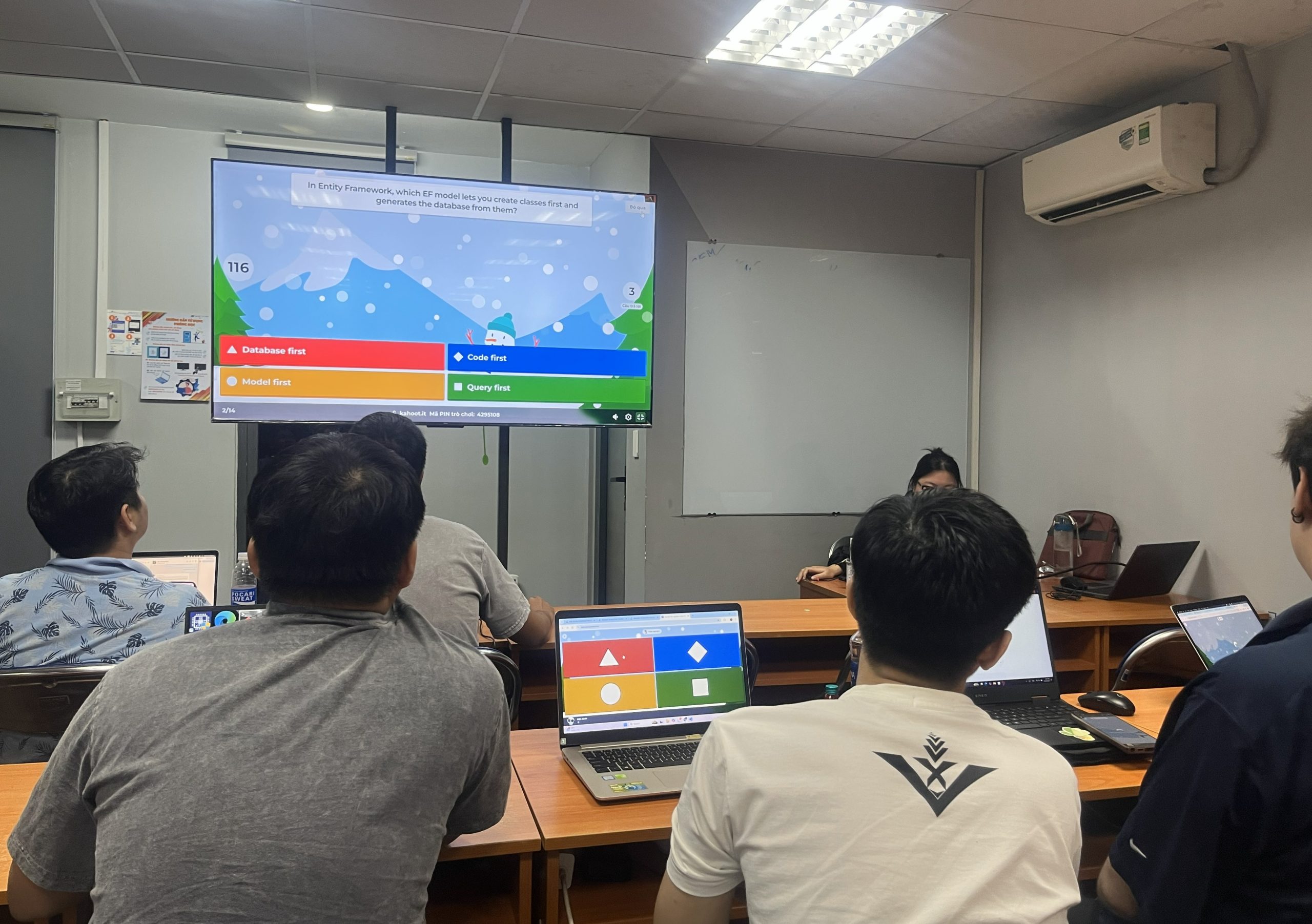 Một điểm nhấn đáng chú ý là nhóm 2 đã chuẩn bị mini game Kahoot để ôn tập nhanh kiến thức vừa trình bày. Trò chơi tạo không khí hào hứng, mang lại trải nghiệm học tập mới mẻ và thu hút sự tham gia của toàn bộ sinh viên.