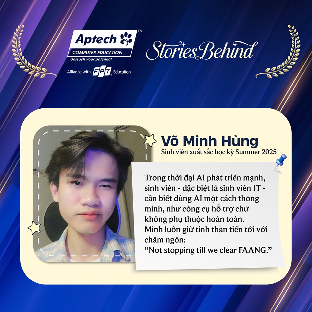 Danh hiệu Sinh viên xuất sắc kỳ Summer 2025 là minh chứng cho hành trình học tập bền bỉ, thầm lặng nhưng giàu nội lực của Võ Minh Hùng. FPT Aptech tự hào là môi trường đồng hành, nuôi dưỡng tinh thần học tập độc lập, tư duy tự chủ và khát vọng vươn xa của sinh viên trên con đường trở thành những chuyên gia IT trong tương lai.